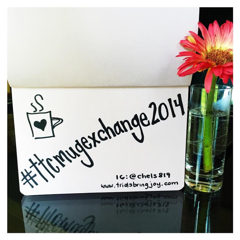 Of course! We LOVE new participants and their friends. They don’t need to be a follower of my blog or instagram account (chels819) to participate. Anyone in the infertility community is welcome to join in. We will be using the hashtag #TTCmugexchange2014 so feel free to share and let’s spread the love! (Also, if you want a live link, you can send them to this one: https://trialsbringjoy.com/mug-exchange-2014/